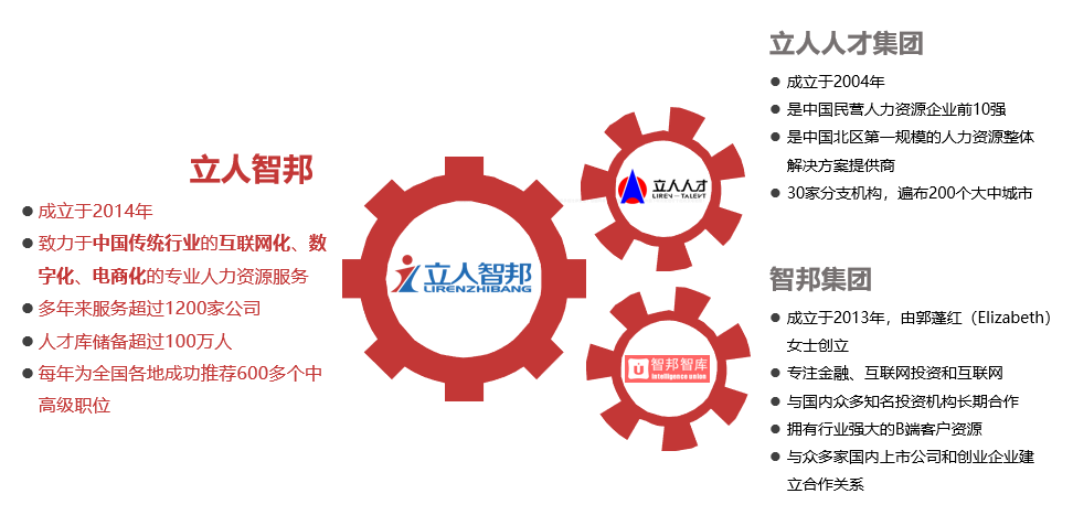 立人智邦成立于2014年,是由立人人才集團(tuán)與智邦人力集團(tuán)強(qiáng)強(qiáng)聯(lián)手共同組建,這兩家公司在業(yè)內(nèi)都具有十余年獵頭經(jīng)驗的著名獵頭公司。立人人才集團(tuán)成立于2004年,是中國民營人力資源企業(yè)前10強(qiáng),也是中國北區(qū)第一規(guī)模的人力資源整體解決方案提供商。立人人才集團(tuán)擁有30家分支機(jī)構(gòu),遍布200個大中城市。立人人才集團(tuán)組織架構(gòu)為事業(yè)部制,外包事業(yè)部、獵頭事業(yè)部(立人智邦)、管理咨詢事業(yè)部、互聯(lián)網(wǎng)+事業(yè)部。智邦集團(tuán)成立于2013年,由郭蓬紅(Elizabeth)女士創(chuàng)立,在創(chuàng)業(yè)初期以專注互聯(lián)網(wǎng)投資和互聯(lián)網(wǎng)被投企業(yè)提供人才服務(wù)為主線,同時 探索二三級城市傳統(tǒng)行業(yè)為輔線。智邦集團(tuán)與國內(nèi)眾多知名投資機(jī)構(gòu)長期合作,擁有行業(yè)強(qiáng)大的B端客戶資源。目前已與眾多家國內(nèi)上市公司和創(chuàng)業(yè) 企業(yè)建立合作關(guān)系,并成就了優(yōu)秀人才的職業(yè)發(fā)展。